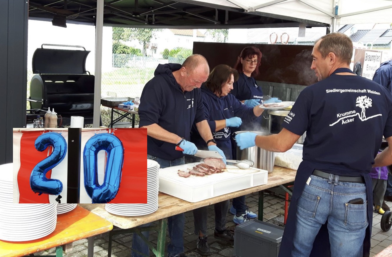 Zum 20-Jährigen bewirteten die Siedler ihre Gäste unter anderem mit einem seit den Morgenstunden im Smoker gegarten Schweinebraten; zum Kaffee gab es eine riesige Auswahl an Kuchen. Die Stadtratsfraktion von Bündnis 90/Die Grünen bedankt sich für die Einladung und wünscht den Siedlern weiterhin Freude und Glück mit und in ihren Eigenheimen.