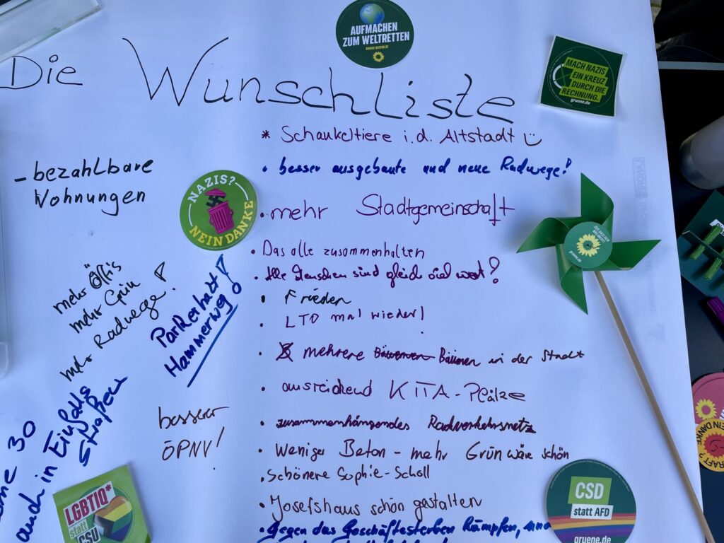 Auf dem Wunschzettel stehen ein besseres Radnetz, ein zuverlässiger und bedarfsorientierter Nahverkehr, eine ausreichende Zahl von Kita-Plätzen, eine Sophie-Scholl-Realschule, in der es sich gern und gut lernen lässt. Weitere Wünsche sind die nach mehr Gemeinschaft in der Stadt, mehr Zusammenhalt, nach mehr Grün, vor allem nach mehr Bäumen, nach mehr Tempo-30-Zonen. Ganz konkret geäußert wurde zum Beispiel auch der Wunsch nach einem Erhalt von möglichst viel Grün auf dem Turnerbundgelände.
