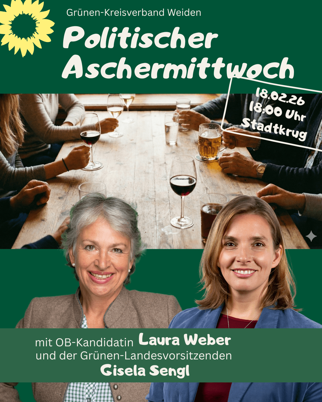 zum Politischen Aschermittwoch am 18. Februar um 18:00 Uhr im Hotel Stadtkrug erwarten wir unsere Landesvorsitzende Gisela Sengl als Hauptrednerin. Neben Gisela spricht unsere OB-Kandidatin Laura Weber, außerdem habt ihr Gelegenheit, unsere Stadtratskandidatinnen und -kandidaten kennenzulernen. Kommt zahlreich, wir freuen uns auf euch!